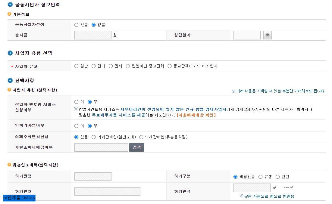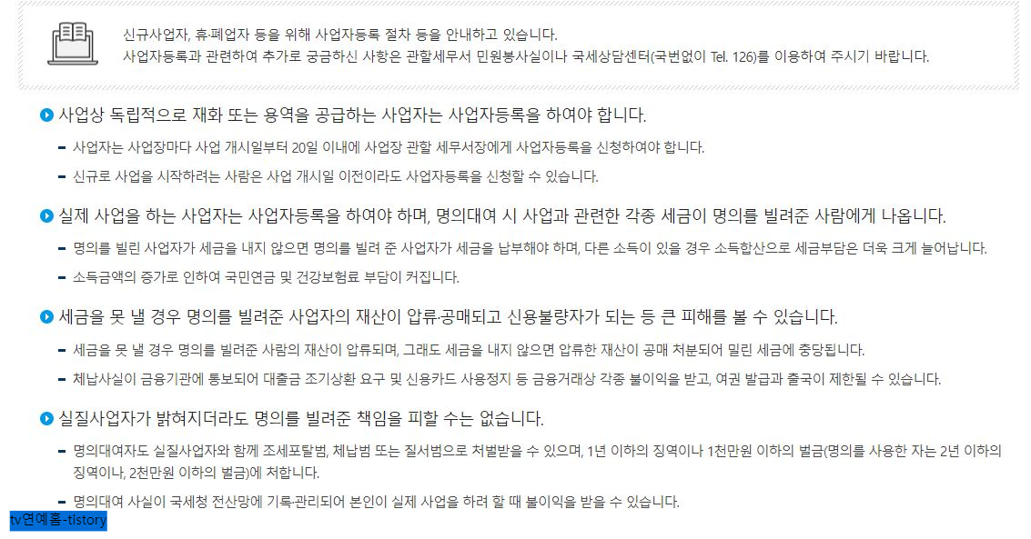 3) 사업자 등록 정보를 주의 깊게 읽으십시오. 사업자의 사업자등록의무 안내를 반드시 숙지하시고, 실제로 사업을 영위하는 사업자는 사업자등록을 하셔야 하며, 명의대여에 따른 세금부담 문제가 있습니다.