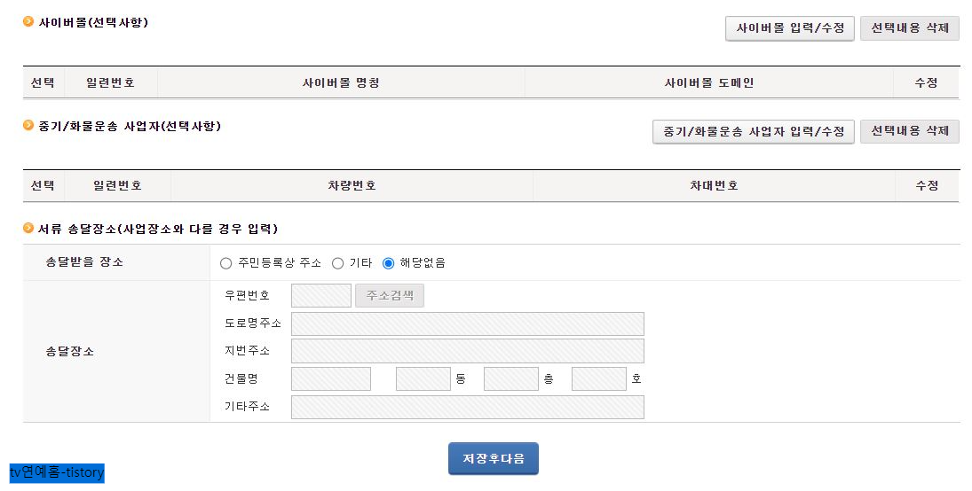 10) 사이버몰, 중/화물운송사업자의 경우 서류발송장소를 입력 후 저장 후 다음 버튼을 터치하여 다음과 같이 신청을 진행합니다.