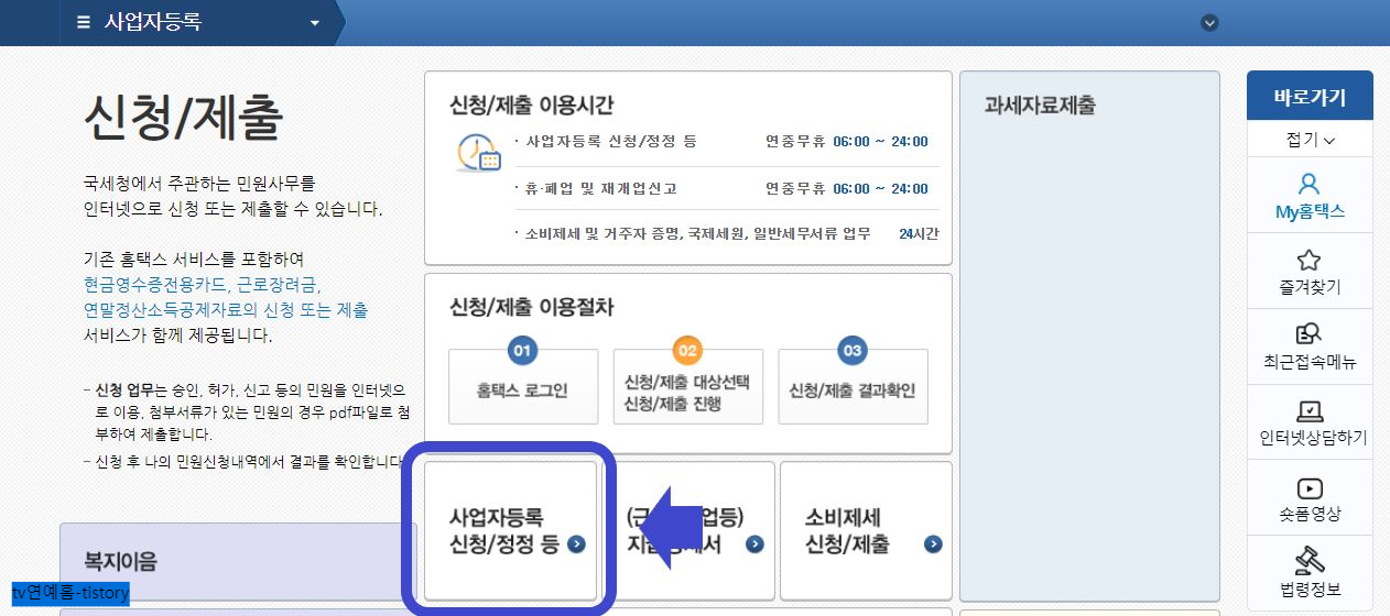5) 사업자등록신청을 터치하면 국세청 홈택스 홈페이지로 이동합니다. 상단 메뉴에서 3번째 신청/제출.