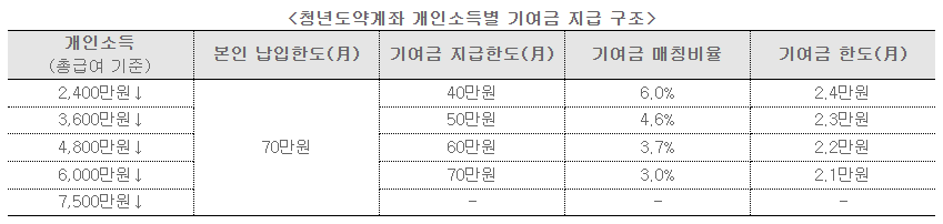 개인 총소득이 4800만원 미만인 경우 월 납입액이 40만원에서 60만원 사이인 70만원 미만이라도 정부부담금 전액을 받을 수 있도록 별도 출연한도를 설정했다.