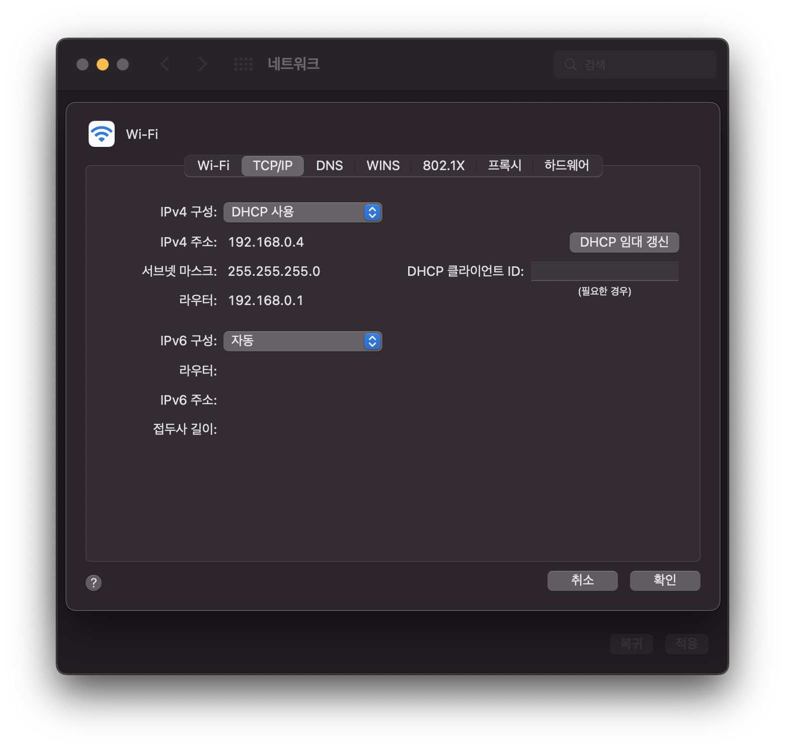 OF_INETIPv4 주소입니다. 시스템 환경 설정 > 네트워크 > 고급 > TCP/IP 창을 보면 네트워크에 IPv4 주소가 할당된 것을 볼 수 있습니다.